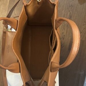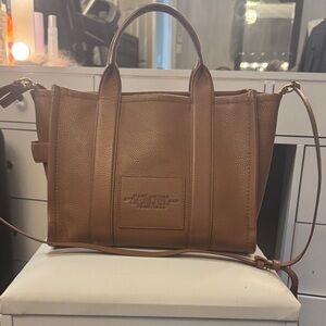 Elegant tan tote with matching wallet. Features bold Marc Jacobs logo. Ideal for daily use.