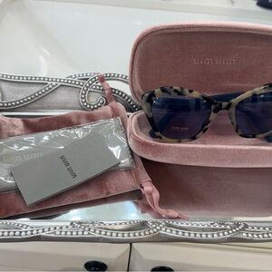 Stylish Miu Miu “Light Havana” sunglasses with blue lenses. Perfect for a modern look.Shaded UV protective lenses. Made in Italy. Brand new in box. Comes with case, cleaning cloth and dust bag.
