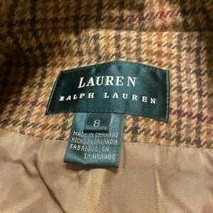 Stylish plaid jacket. Features classic collar. Perfect for layering.