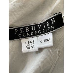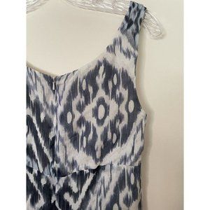 Gently pre-owned Peruvian Connection fit and flare A-line dress in blue and white. Ikat pattern with white lining. Sleeveless with scoop neck in front and back. Ramie material. Zip closure in back. In good condition.