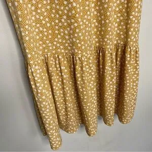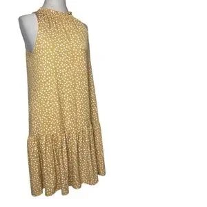 Stylish gold-ish yellow sleeveless dress with a flouncy flowy super cool and comfy design. Ruffled bottom and neck line. Wash, hang and wear! Perfect for casual outings. In excellent Pre owned condition! Size Medium she measures pit to pit 20” and is 36” from shoulder to hem.