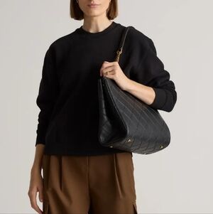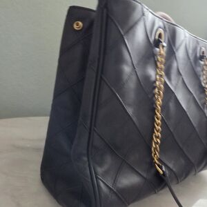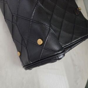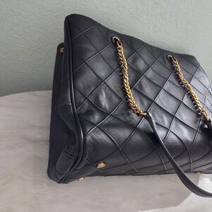 Chic black tote with quilted design. Features elegant gold chain handles. Perfect for everyday use.