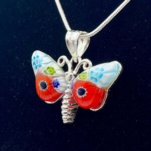 Vibrant Murano Millefiori Glass Butterfly 925 Sterling Silver Pendant