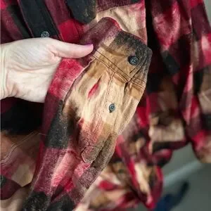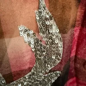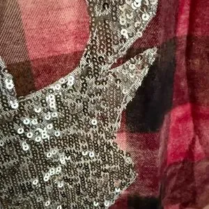 This limited edition, boutique purchased flannel features a bleached-plaid trendy rustic vibe with a fun twist --- a sequin deer silhouette on the back!
