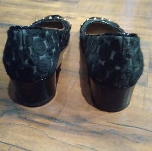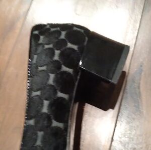 Excellent pre owned condition. Napoleoni - Patent & Calf Hair Polka Dot Heels. Patent cap toe and heels. Black polka dot calf hair. Gold stud cross bar. 3" block heels. Cushion insoles. Made in Italy.