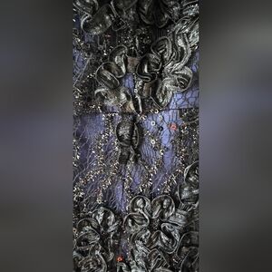 A few sequins missing as expected with heavily embellished gowns — this is normal wear and virtually undetectable when worn. The lace, ribbon work and overall structure are in excellent condition. This dress photographs beautifully and wears even better
