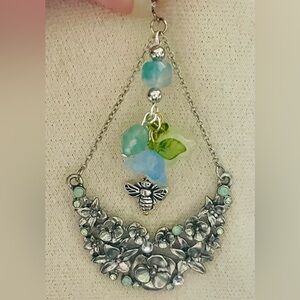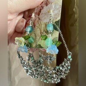 Elegant dangle earrings featuring floral designs in silver and green opalite gems. I added the middle piece with flower pastel yellow and blue glass flowers and charming bee charm. Semi precious stone beads used also. Perfect for adding a touch of nature-inspired beauty to any outfit.