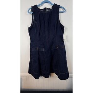 Sleeveless crew neck mini dress in a classic dark rinse denim wash. This structured piece features princess seams for a tailored fit, a full back zipper closure, and decorative front welt pockets with gold-tone button details. The flared skirt silhouette and contrast topstitching provide a timeless, versatile look suitable for layering or wearing on its own. Crafted from a durable denim blend, it offers both style and comfort for everyday wear.