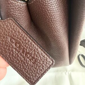 Polished pebble leather Magnetic snap closure leather and fabric lining Side open compartments Handles with 5 drop Detachable strap with 21 1/2 drop for shoulder or crossbody wear 8 3/4 (L) x 7 (H) x 5 1/2 (W) Style No. CM545