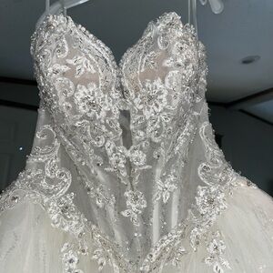 Stunning strapless gown with beading intricate lace bodice and flowing tulle skirt brand new Randy Fanoli also have viel and extra petty coat all brand new all authentic Randy Fenoli selling at the best price 2.000.00