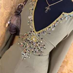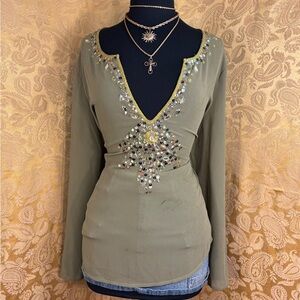 ✨Vintage Y2K Boho Beaded & Sequins Deep V Neck Olive Blouse✨