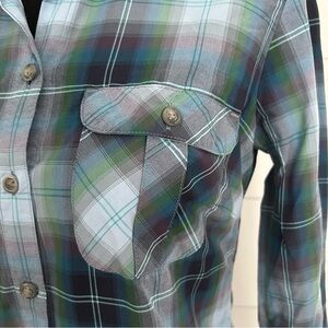 Eddie Bauer women's "Mountain" long-sleeve shirt. It features a classic plaid pattern in shades of blue, green, and purple. A regular-fit, button-front shirt with a collared neckline and two chest pockets with button flaps. Designed for casual occasions and outdoor activities, it includes roll-tab sleeves that allow you to adjust the sleeve length.