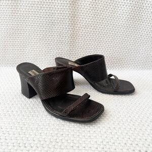 Size 7 from Steve Madden. Vintage. Style name Justice or Justine (partially rubbed off). Leather made in spain. Brown croc textured block heel slip on sandals with double strap detail. Sleek sophisticated minimalist style. Preowned in good condition with light signs of wear throughout. See photos for overall condition.
