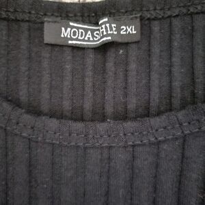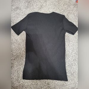 Stylish black ribbed shirt with short sleeves. Perfect for any occasion. longer length body, with split side hem