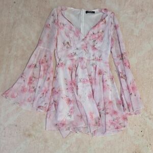 Chic Pink and Blue Floral Bell Sleeve Blouses