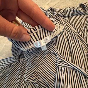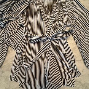 Stylish navy and white striped kimono top. Features a tie waist and wide sleeves.