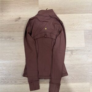 Chic brown leggings set by Lululemon Athletica. Features a stylish jacket with gold zipper accents. Perfect for active wear.