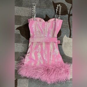 Nadine Merabi Fifi Iridescent Sequined Pink Belted Mini Dress w Ostrich Feather Hemline.