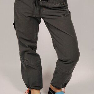 • Cargo cutie!! Stone grey low rise cargo pants with front and side pockets, orange drawstring cuffs, and built in rope belt. Each side can unzip to make into capris.