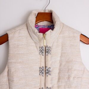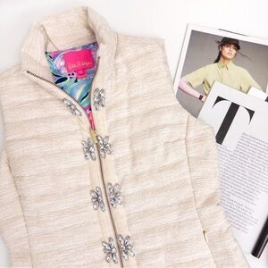 This Lilly Pulitzer piece is known for its "Resort Boucle" texture. Features a shell made from a blend of cotton, polyester, and metallic fibers, giving it a subtle sparkle.