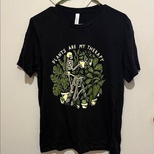 Black t-shirt featuring a graphic design with plants and text 'Plants Are My Therapy'. Worn and washed once. Women’s XL.
