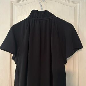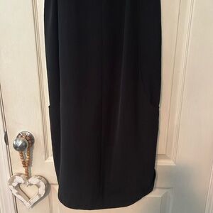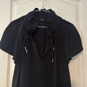 Chic black midi dress by Hugo Boss. Features a sophisticated design with short sleeves. Ideal for elegant occasions. In good pre-owned condition. Size 6 - 19 inches from pit to pit and 38 inches from shoulder to hem. Ties at neck can be worn different ways. Side pockets. 100% polyester. Made in Turkey 🇹🇷 Thank you for looking!