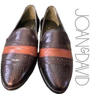 Vintage 90s two-tone leather loafers from the Italian-made Joan & David. These handmade classic slip-on shoes feature a black leather base with a contrasting tan / reddish-brown horizontal band across the vamp, accented by detailed brogue perforations (wingtip-style punch holes). Pointed Almond Toe.
