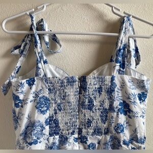 This lovely midi dress features a beautiful blue floral pattern on white with tie straps and a fitted bodice. Perfect for tea parties, Sunday brunches, Easter events, and other upscale spring and summer outings. In great condition!