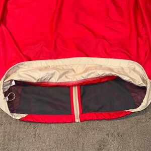 Columbia jacket with a bold red and cream design. Features a hood and full zip closure. NWOT. Never worn.