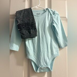 Adorable light blue long sleeve onesie paired with stylish black ruffled pants. Perfect for a cozy and fashionable look for your little one.