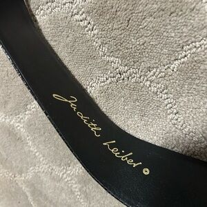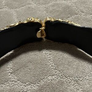 Elegant Judith Leiber belt featuring a striking black band with ornate gold accents. Perfect for adding a touch of luxury to any outfit.