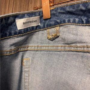 Torrid Denim “Boyfriend” jeans in a classic medium wash. Relaxed boyfriend fit with distressed/ripped details and a raw/frayed hem. 5-pocket style with button + zip closure. Easy everyday denim, cute cuffed with sneakers or booties.