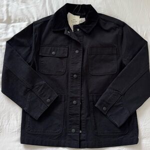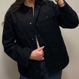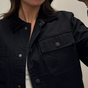 Black utility jacket by H&M. Features corduroy collar and multiple pockets and a button-up front.