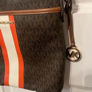 Elegant Michael Kors messenger bag with bold orange and brown design. Features signature logo pattern and adjustable strap.