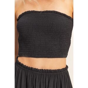 Top: Smocked, stretchy tube-style crop top with ruffle trim.
