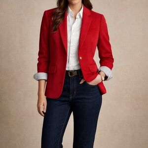 Classic and polished Julian Leopold Studio red blazer featuring a tailored silhouette and subtle textured fabric. This structured jacket has a timeless one-button closure, flap pockets, and striped sleeve lining that can be cuffed for a chic preppy look. Perfect for workwear, business casual outfits, or layering with denim for an elevated everyday style.