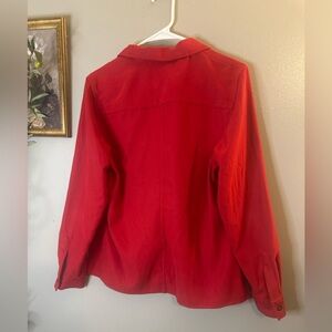 Crazy Horse by Liz Claiborne red button-front utility shirt in size medium. This classic structured blouse features a collared neckline, chest utility pockets, and durable stain-resistant fabric making it perfect for everyday wear, travel, or workwear styling. The rich red color and structured silhouette give this piece a timeless western-inspired aesthetic that pairs effortlessly with denim, trousers, or skirts.
