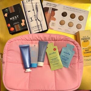 Pink cosmetic bag featuring a selection of skincare products. Includes items from Skinfix, Dior, Nest, Haus Labs, Summer Fridays and other brands.