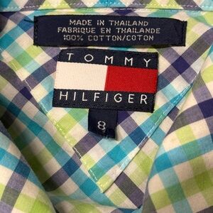 Classic Tommy Hilfiger plaid button down in a really fun blue, green, and white color combo. Perfect for school, spring photos, Easter, family gatherings, or just an easy everyday outfit.