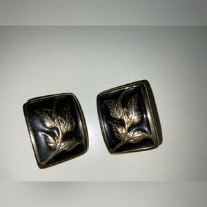 Vintage Gold Tone Leaf and Black Enamel Mid Century Vibe Clip On Earrings