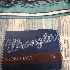 Wrangler short sleeve western shirt features a classic vertical stripe pattern in teal, navy, and white. Designed with X-Long Tails for a secure tuck, this button-down includes dual chest pockets with button closures and a traditional pointed collar. The lightweight cotton fabric and relaxed fit make it an ideal choice for casual wear or outdoor work.