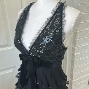 Chic black silk dress with a V-neck halter neckline. Features sequin embellishments and tiered layers. Black velvet bow under bust