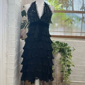 VTG CACHE LUXE Black Silk Sequins & Beaded Tiered Ruffle Backless Halter Cocktail Babydoll Dress