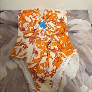 Cupshe one-piece with vibrant orange floral print on white. Bandeau-style top with halter tie and front cutout. Ruched bodice with tie detail. Flattering, feminine silhouette for beach days.
