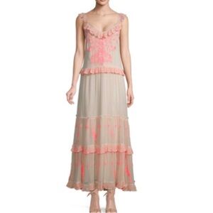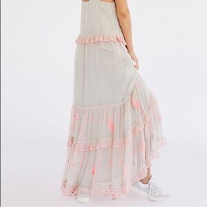 Beautiful Free People boho maxi dress with soft embroidered floral details and ruffle trim. Features a flowy tiered silhouette, lightweight fabric, and delicate straps with feminine ruffle accents.