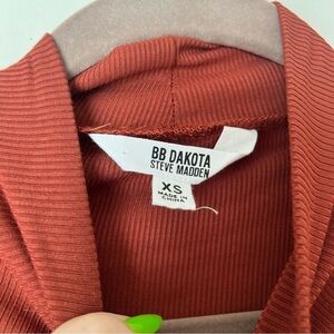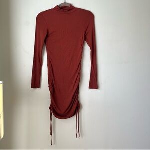BB Dakota by Steve Madden Rust RIbbed Knit Bodycon Ruched Mini Dress XS. Ruched on sides. long sleeves. mock neck. Pit to pit 14", waist is 13" across, length 35".