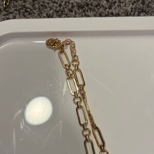 Gold chain necklace with coil rings.