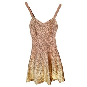 This is a Free People ombré A-line dress. It has a beige top and cascades into a gold metallic foil with floral lace throughout. It has wide adjustable straps and is lined with lots of stretch. It has a zipper closure.