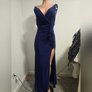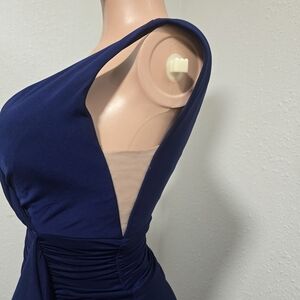 Stunning navy maxi dress with ruched front. Sleeveless with a chic slit. Ideal for formal events.