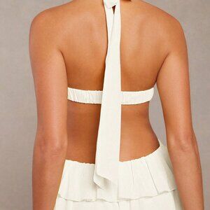 Elevate your style with this elegant apricot maxi dress, showcasing a halter neck, intricate rosette accents, and cascading ruffle details. The sleeveless, slim‑fit silhouette features a natural mid‑waist and a flattering A‑line shape, while the lined interior adds comfort. A flared, floor‑sweeping hem completes the sophisticated look.